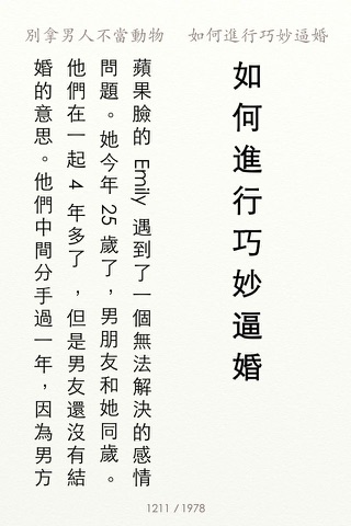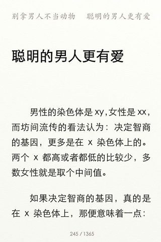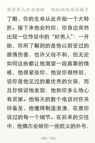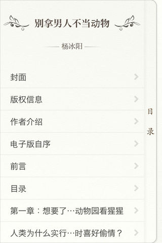 支持iPhone/iPod touch,暂不支持iPad ----稻城版---- ● 含3种排版:「简体横版」、「繁体横版」、「繁体竖版」 ● 版权所有 · 侵权必究 ----关于稻城---- ●「稻城新阅读」致力新锐电子阅读,正版授权,鼓励文化创造 ● 艺术家和排版专家投入心血,协助计算机工程师,用创造艺术品的态度来制作「读物」 ● 考究的处理字距、行间距、段间距、段首缩进、简繁体、横排竖排、渲染、锯齿平滑等 ● 独有先进算法。无时滞实现「翻页」「字体调节」「进度控制」等功能。更做到极速实现「图文混排」「多媒体混排」「文字竖排」等复杂排版效果转换。非常规电子书可比 ● 首次推出独有「笔记」功能 ----本书简介---- 杨冰阳,网名ayawawa。情感分析专家,多栖艺人,Mensa(门萨)会员。为《全视界》、《现代女报》、《大学生周刊》等多家报刊杂志开过专栏。曾出版文学作品《女人想结婚,男人想私奔》、《恋爱厚黑学》、《我和幸福有个误会》等。两性感情这个话题,即古老又神秘,也许只有糅合多个学科,融汇多个领域,站在多个角度来审视,才能把握其本质。这本《别拿男人不当动物》,融合了经济学、生物学、社会学、进化心理学等多学科理论的著作,具有极强的“美第奇效应”。该书从亲职投资理论切入,引出男女之间在择偶策略、性和婚姻等问题上的矛盾,指出对待采取混合择偶策略的男人们,处于弱势的女人们应该如何自我救赎。对于处于现在这个开放社会中的天真女人,无疑是一剂猛药。 ----产品特色---- ● 排版。艺术家、排版专家、计算机工程师投入心血共同制作。考究处理字距、行间距、段间距、段首缩进、渲染、锯齿平滑等 ● 笔记。首次推出独有「笔记」功能 —— 阅读兴之所至,随时写下保存阅读感受。笔记可选字体(仅支持iOS 5),字体大小,背景 ● 笔记。手指向上滑动,即可添加笔记 ● 书签。手指向下滑动,即可添加书签 ● 删除。手指按住书签或笔记,向外拖曳, 松手,即可删除书签或笔记 ● 风格。5种风格的阅读界面:稻城、浅咖、拟书白、拟书褐、湖蓝 ● iBook风格。考虑到您可能已经习惯iBook界面,我们提供了iBook拟书白、iBook拟书褐两种风格 ● 字体。阅读字体大小调节,极速实现 ● 亮度。屏幕亮度调节(仅支持iOS 5) ● 翻页。有「正常」「颠倒」2种模式,分别考虑了右手持机用户和左手持机用户翻页便捷 ● 进度控制。页码/阅读进度,一次点击实现转换 ● 阅读时间记录 ----使用指南---- ★ 直接访问http://dcpublish.com/app/general/aHelp.htm ★ 或者,进入app「设置」界面,点击「帮助」按钮 ★ 或者,在微博和email中向我们咨询 ----互动联络---- ● 喜欢「稻城新阅读」, 建议新功能? 请在下面留言 ● 关注「稻城新阅读」最新动向,关注微博 (「稻城新阅读」微博: weibo.com/dcpublish) ● 客服,个人机构出版合作,商业合作,请联系 contact@dcpublish.com