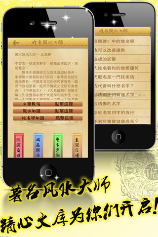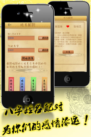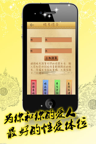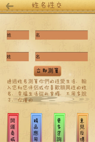 姓名测算新版集合2013年最新的姓名测算模块,给予您最全面的测算体验。从性格命理到爱情发展等等各种命理运程,为您准确地解决种种疑难问题。 姓名测算新版:国内最有权威性的姓名测算, 通过现在最流行的姓名学研究, 判断这个名字的命理的未来 走势。 【姓名测算新版】应用通过姓名的笔画, 声调、音律、部首这几个方面来对你的命理进行详尽的分析, 为你算出你想要了解的运势。 姓名测算新版特点: 1:通过姓名测试你们的性爱生活 2:提供最专业最权威的姓名测算服务 3:通过姓名测试预测男女配对指数 4.测后支持微博、邮件分享,好友互动 5.测算准确,趣味性强,休闲时尚 6.专业的大师指导,内容准确 7.详尽的分析,为你算出你想要了解的运势 国内最有权威性的姓名测算, 通过现在最流行的姓名学研究, 判断这个名字的命理的未来走势。先天八字 与人的姓名, 好比人的身体与精神。八字是人的身体, 姓名是人的精神, 精神旺则身厚, 精神薄则身弱; 精神长存则身生, 精神枯竭则身死。此亦可证明人命运之枯荣顺遂、得失、吉凶、祸福, 与姓名之暗示语 诱导力是事实, 绝非可疑。故姓名凶吉的重要性已逐步被人们接受认识。姓名决不仅仅是代表一个人称呼 的简单符号, 它可以通过姓名中字的形、音、义、数、组合等所产生的五行磁场的诱导力, 影响人一生的 性格、健康、事业、婚姻、财运、人际关系等诸多方面。其中姓名的数理对人的健康影响较大。姓名数理 与健康的内在关系, 主要通过天格、地格、人格三者之间相生相克而表现。姓名测算应用通过姓名的笔划 , 声调、音律、部首这几个方面来对你的命理进行详尽的分析, 为你算出你想要了解的运势。