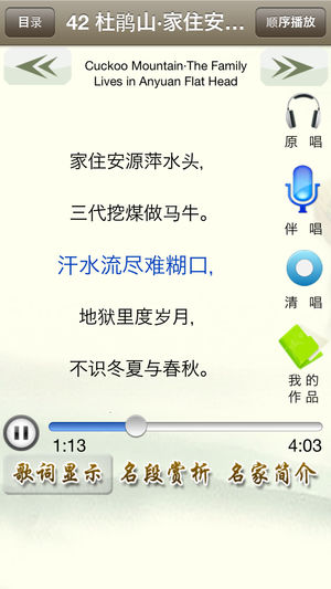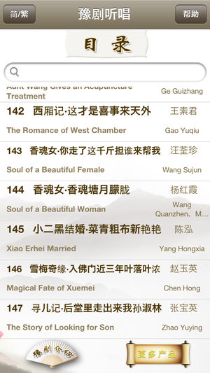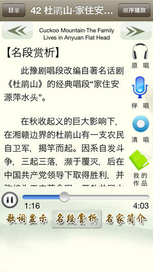 《豫剧听唱》产品提供了由147首名家演唱的精彩的豫剧名段,包含“原唱、伴奏、清唱、我的录音”等功能,便于模仿和欣赏名家的演唱;原唱、伴奏演唱时,歌词同步显示;我的录音,便于用户管理自己演唱的豫剧唱段;产品还配有豫剧简介、豫剧文化、名家简介及名段曲目赏析;同时还增加了按需下载功能,方便用户选择所需的曲目。 《豫剧听唱》产品,具体包含以下豫剧名段。 朝阳沟•银环你该怎样看待自己 大祭桩•恼恨爹爹心不正 断桥•恨上来骂法海不如禽兽 花木兰•但愿得二爹娘长寿百年 花木兰•刘大哥讲话理太偏…