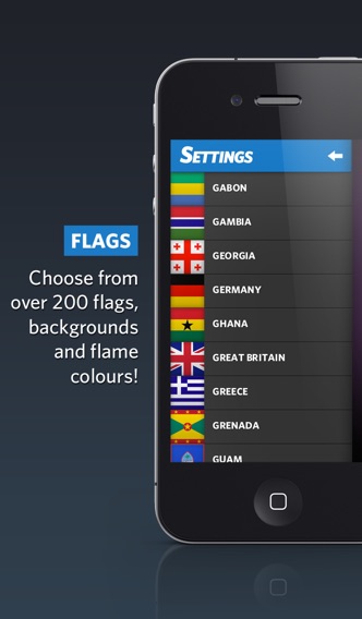 Turn your phone into the winter Torch 2014! Want to support your team? Then download the Torch 2014 app and wave the flame high! Fully customisable to your nation's flag! All you have to do is flick on the flame and hold it in the air for the whole world to see... no need to carry around flags and hats when you can pull this out from your pocket! Features: - Realistic flame effect animates in front of your flag - Choose from 210 international flags - Easy to browse and change your flag - Change the color of the flame!