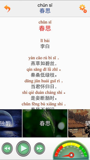 熟读唐诗三百首, 不会作诗也会吟。《唐诗三百首》是家喻户晓的儿童诗教启蒙书, 也是中小学生接触中国古典诗歌最好的入门书籍。《每日必听国学》提供的不仅是一本精美的有声诗集,更是学习中华国学的好帮手。吃饭时、睡觉前,不用盯着屏幕,诗词连读,听久了自然印象深刻;空闲时,对对诗句,试试拼音,看看难字,练一练总会有所发现,测一测看看会了多少。 *翻一翻,每一首诗词都是经典。 *听一听,听多了自然会背。 *读一读,读诗百遍,其意自现。 *查一查,诗词注音、注解、译文和评析。 *背一背,文以载道,培养中华文化基本修养和人格修养。 《每日必聽國學 唐詩三百首》每首詩不僅有原文,還有附帶有拼音、注解、韻譯…