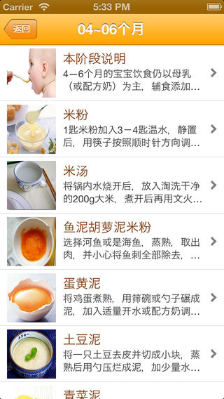 宝宝辅食大全,旨在为妈妈们提供最全面的宝宝营养知识和各式美食制作方法。宝宝吃得好,妈妈才放心,让宝宝在美食中健康成长吧! 【说明】 宝宝在出生4个月以后,单纯的母乳喂养满足不了宝宝生成发育的需要,这时候父母需要给宝宝添加乳制品外的其他食物,这些逐渐添加的食物就称为辅食。 【温馨提示】 科学营养的食谱,可以帮助宝宝们有效的吸收营养。 【各阶段简要说明】 04-06月: 尝试吃的阶段 06-08月: 学习咀嚼和吞咽阶段 08-12月: 建立三餐三点饮食模式阶段 12-24月: 向成人饮食模式过渡阶段 【吃出健康】 无论是妈妈们给宝宝自制的辅食还是从超市买的辅食产品,在给宝宝喂食辅食时都应遵循由稀到稠、由细到粗,添加的量由少到多,循序渐进的原则。开始时一次只能喂一种新的食物,等宝宝适应后,再添加另外一种新的食品。 从少量到多量:即从喂果汁、菜水起,第1天喂1~2小勺,大约10毫升;第2天喂20毫升;逐天增加。 从稀到稠: 比如从米汤到稀粥,从稀粥到稠粥,从稠粥到软饭,就是由稀到稠的典型演变。 从细到粗: 比如从米汤、稀粥、稠粥、到软饭;从面糊、烂面、碎面条、馄饨到包子、饺子等。