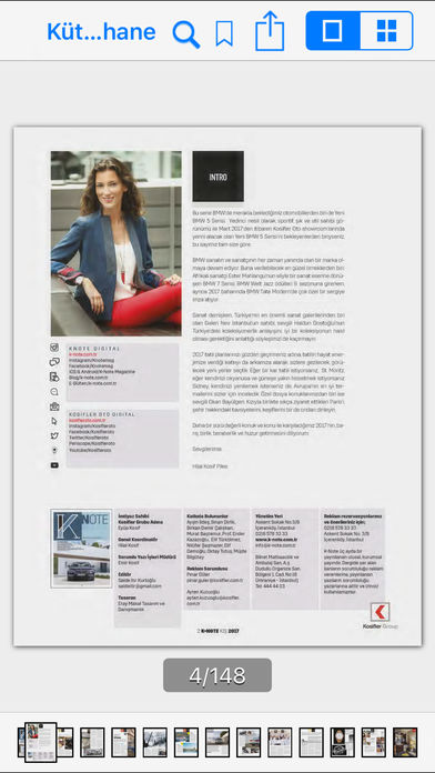 Kosifler Oto tarafından sunulan K-Note Dergi Platformu, dergi okumaktan aldığınız keyfi maksimum seviyeye getirmek için, iPad’in sunduğu bütün teknolojik fırsat ve yenilikleri kullanarak geliştirildi. iPad üzerinde dergi okuma keyfini bir çıta daha yükselten K-Note, hareketli ve sesli dergi kapakları, yüksek çözünürlüklü fotoğrafları, video ve müzik gibi multimedia içerikleri sunarak yepyeni bir okuma deneyimi sunuyor.