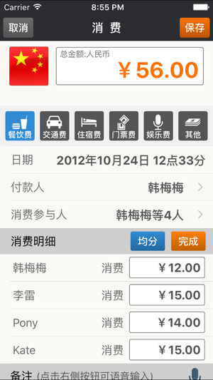 【 最简单好用的多人记账、结算和分享小工具!旅行、聚会、合租、同事饭团之必备神器〜】 AA账本——多人帐目,轻松结算! ************* 解决的问题 ************* 多人AA消费时,每个环节付款人不同、实际消费金额各异,帐目计算异常复杂: 【旅行】今天张三付了300元住宿费,明天李四付了600元门票钱,旅行结束时全忘了; 【聚会】李雷只参与了吃饭;韩梅梅只参与了K歌;按总额做除法不合理; 【合租】隔壁买灯泡花了20元,我修洗衣机花了200元,电费是小张帮忙交的,总不能直接做除法吧? 【同事饭团】悟空吃了5元的桃,八戒吃了45元羊腿,按人均25元AA,悟空不高兴!…