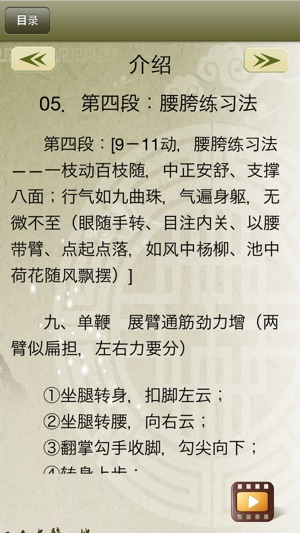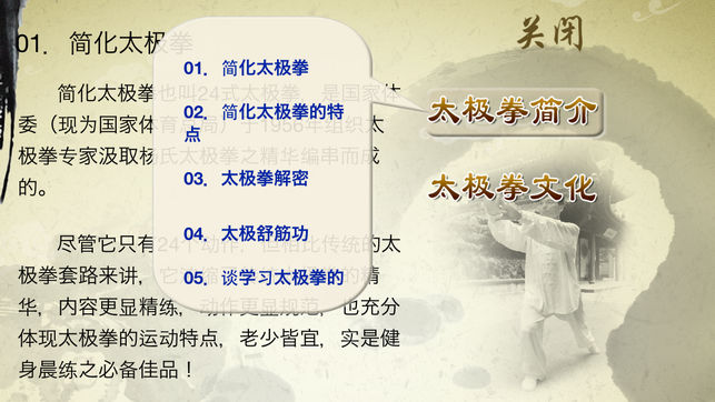 简化太极拳也叫24式太极拳,是国家体育总局于1956年组织太极拳专家汲取杨氏太极拳之精华编串而成的。共24个动作,它浓缩了传统太极拳的精华,内容精练,动作规范,重点突出,充分体现太极拳的运动特点,老少皆宜,实是健身晨练之必备佳品! 产品示范视频由国际武术裁判指导制作、动作精准;教学采用完整示范演练与分段讲解教学、要点提示相结合的方法,对每个动作要领进行详细的讲解示范;产品还配有太极拳分段讲解的文字说明,便于理解。 简化太极拳24式动作名称具体如下: 1. 起势 2. 左右野马分鬃 3. 白鹤亮翅…