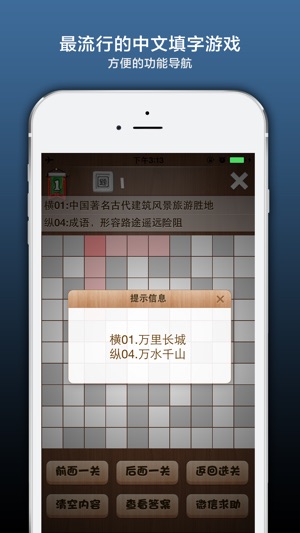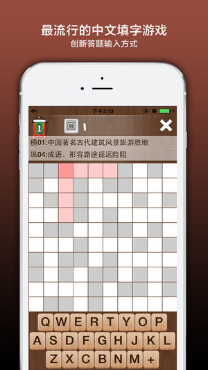 疯狂填字是最早的在线中文填字游戏,现在你可以在手机上玩填字了,既打发了时间,又增长了知识,你准备好挑战史上最疯狂的中文填字游戏了吗? 1、游戏一开始只有几道题可以选择 2、游戏时请选中空格查看提示 3、点击字母按键输入首字母拼音 4、正确完成词条就会转换为汉字显示 5、点击+号弹出功能菜单 6、完成题目80%解锁下一题 7、完成100%可以解锁答案,而且再奖励解锁一题 8、完成或购买道具解锁后可以双击查看答案 帮助中心还可以 1、切换音效开关 2、切换标准键盘模式 3、切换答案双击显示 4、查看操作介绍 5、推荐给微信朋友圈 应用提供两个付费道具,一个解锁全部关卡,另一个…