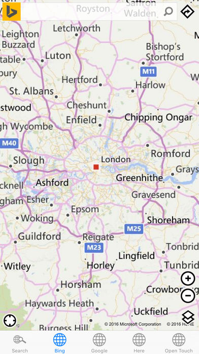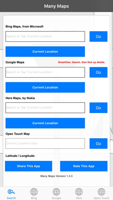 No map is perfect. Updates are rolled out to different maps all the time. Some maps have roads or places missing... With this app you can compare Maps from Bing, Google, Nokia and OpenTouchMap. This app allows you to switch between the 4 different mapping providers, using their online web apps.* Bing Maps is the mapping solution from Microsoft. In previous incarnations it has been known as MultiMap and MapPoint. Views include Bird's Eye and Aerial. Google Maps is the mapping solution from Google. Satellite, Traffic and Bicycling Views are available. The famous Street View is also available after you search for a location.^ Nokia Maps, or Here Maps as it is now called, uses NAVTEQ mapping data. Views include Satellite View, Public transport view and Live traffic view. OpenTouchMap is based upon OpenStreetMap, a community supported mapping implementation. Use your current location#, or search for a specific location. * Internet Connection Required # You must grant permission to the app, including the inner web-apps, allowing them to use your Current Location information. ^ To use StreetView, you must search for a location, then flick the screen up from the search result information. StreetView is only available in selected countries and areas.
