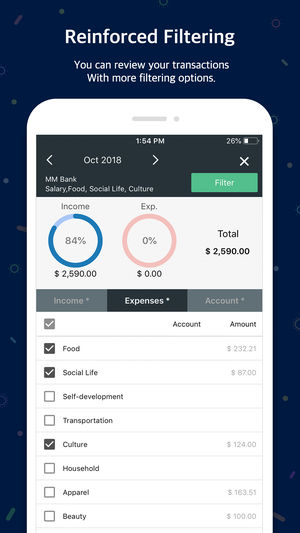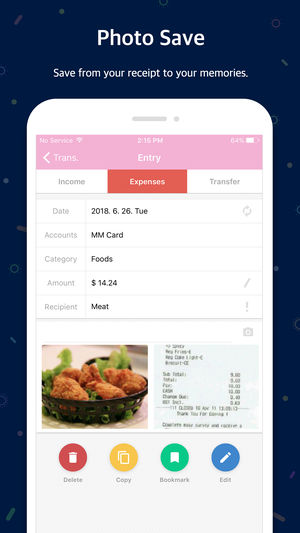 管家计帐薄很复杂。但我们将复杂性降低至最小,使其简单便利。 管家计帐薄使用十分简单。在基本画面上就可以使用各种功能, 通过设定,还可以随意调整详细的功能。 您可以通过wi-fi功能浏览“管家记帐”应用程序 您可以在电脑屏幕上编辑和分类数据,目录或者帐户,并实现与手机的数据同步。并且,您还可以在电脑界面中浏览您帐户的数据。 支持双重复式记帐。使记帐更加方便快捷。 预算管理功能:您可以管理您的预算。该应用通过图表显示您的预算和支出。所以您可以快捷的对比您的支出和预算 信用卡/支票卡功能:当输入一个未来支付日期,您可以预览支付数额和为结算的金额。您可以连接您的帐户使支出自动添加…