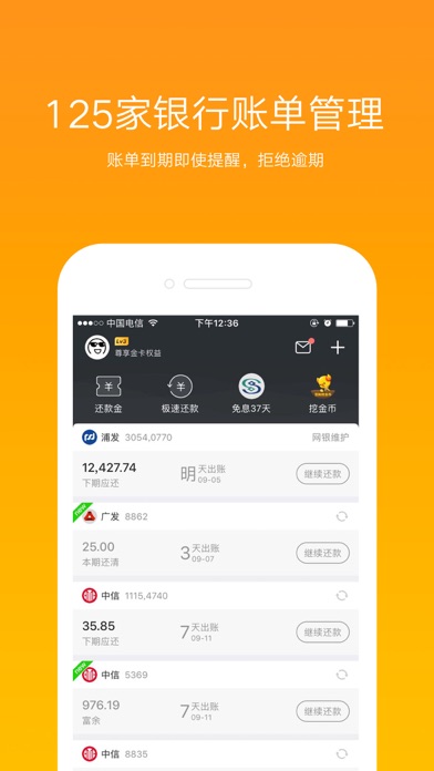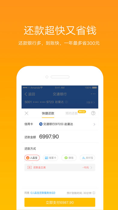 信好有你,51信用卡管家C轮融资4亿美金; 5周年感恩回馈,亿万红包帮你还款理财贷款 -信用卡帮你查询还款,一亿现金红包帮你还 -组团理财冲榜赚一“波”,一亿理财金帮你赚 -人品贷信用好,最高999元现金红包帮你省 1亿用户选择使用: -信用卡全面服务:账单一键查询提额、还款立减30元。 -贷款产品好:额度5000-10万,最快一天放款。 -理财安全收益好:灵活理财、收益6%-10.6%。 -增值服务多:征信、公积金快捷查询,办卡买保险服务一键办理。 【获得荣誉】 中国互联网金融协会创始会员 胡润2016中国新金融50强 福布斯中国互联网金融50强 【产品特点】 安全:由“中国人民财产保险”承保,保障您的账户安全。 简单:一键绑定邮箱,无需录入任何信息,全自动解析信用卡电子账单,一键完成人品宝&支付宝&微信还款。 贴心:及时提醒还款,账单永不逾期。功能齐全,一网打尽所有信用卡周边服务。 优惠:各行信用卡优惠信息实时更新,省钱吃喝不能停。 【联系我们】 官方网站:https://www.u51.com 官方微博:https://weibo.com/51zhangdan 微 信:xinyongka51 投诉建议: 4008705151