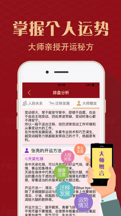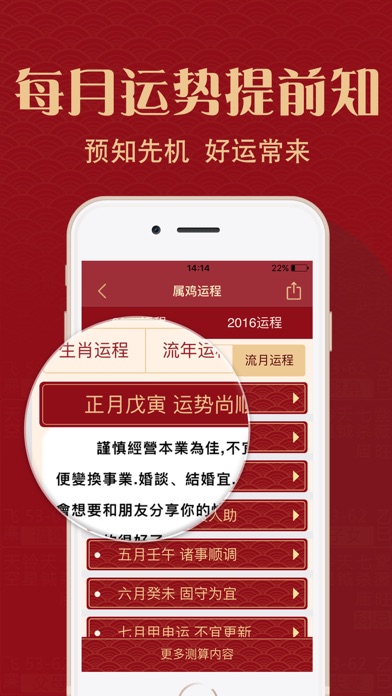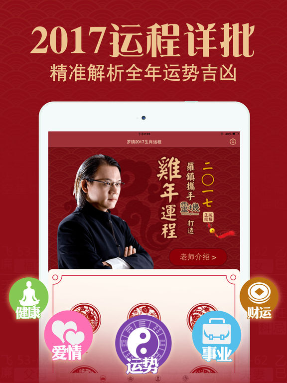 ***App Store连续五年最畅销运程应用,超过1000万用户使用*** ***全球最专业的命理品牌灵机妙算极力推荐,最精准易用的运程应用*** 2017年事业、财运、感情运势如何? 2017年如何全方面提升自己的运势以迎接挑战? 2017年大师运势全面为你分析鸡年运程,未雨绸缪提早预知运势变化! 【应用简介】 『2017大师运程』由台湾著名的命理专家罗镇老师亲自编写,为每一个生肖的的整体运势、五行运势、流月运势等命理运程方面进行了深入的研究,得出了这个最详尽的2017年运程预测。为大家分析2017鸡年财富、工作、感情、健康运程运势变化、走向及化解之道,并且给大家提供了最准确的2017年十二生肖的凶吉运程和化解开运方法。 【大师介绍】 罗镇老师生于台湾命理世家,自幼研习手面相、阳宅风水。执业至今二十载,精通易经占卜、紫微斗数、八宅风水、玄空吉凶的绝诣。 2017年十二生肖运程预测是罗镇老师最新的运程命理的研究成果,他结合“五子运”原理,并和大自然进行了天人互动的交流撰写出来的。 “五子运”指按照古代历法里面的天干和地支再结合配合地球上四季气候变化来进行计算而得出的六十年流年运数分成五种不同属性的流年运数 【品牌支持】 灵机妙算是全中国和海外最著名和最专业的命理品牌,与上百位著名的命理老师合作,为大家提供最精准的命理知识和应用。 【应用特色】 1、台湾著名命理师罗镇老师亲自编写,内容丰富专业性、实用性强。 2、精准全面的运程分析,用户全面了解新年运势变化,逢凶化吉。 3、丰富民俗避凶方法,犯太岁生肖轻松化解。 4、十二生肖、具体年龄生人运程,流年、流月运程内容丰富详尽,可读性强。 5、操作简单,内容专业易懂,支持微信、微博分享,关心亲人好友一步到位。 6、界面精美,具有特色的中国风格,生肖剪纸,简约又显大气。 【联系我们】 网 站:http://m.linghit.com/ 新浪微博:灵机妙算 Facebook: https://www.facebook.com/linghit 网易博客:http://gzding.blog.163.com/ 微 信:灵机妙算(lingjimiaosuan)