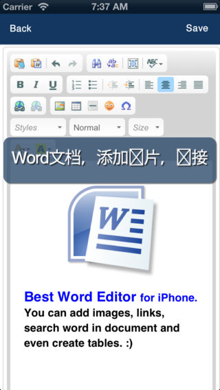 Office Reader Pro是一款强大的Office全能套餐应用,涵盖微软Office中所有的软件以及完整版本的PDF Annotation的所有功能,包括: •Word 文档和 Spreadsheet 文件的创建、编辑; •表格、文件的填写、签字; •图形绘画、草图设计及分享; •将多页文件扫描成高清PDF文件; •兼具功能强大、操作方便的文件管理功能,支持Word、Excel、PPT、PDF、及多种格式的图像、音频、视频文件。 请尽情体验这款应用带给那您的惊喜吧! 应用列举 * 随时打开、创建、查看以及编辑Word文档,包含导入功能。 * 将Word 文档转换成PDF。 * 随时创建、查看电子数据表。 * 阅读、编辑PDF文件和电子书并对其进行注解。填写PDF表格、签署PDF文件。 * 在PDF文件中添加现场录音、音频注解。适用于各种教学、会议、笔记等,音文并茂。 * 二十余款文件及商业信函模板。 * 图形绘画及草图设计。 * 拍摄快照、添加文字注解并与朋友分享。 * 将您最心爱的照片转换成绘画。 * 将图片扫描成多页PDF文件。 * 创建视频文件。 * 播放媒体文件:音频、视频以及图片。 * 将照片和文档存入加密文档。 * 文件备份。 * 将文件从电脑Mac/PC到苹果移动设备双向传输 * 从Dropbox、Google Drive、Sky Drive、Wifi等双向传输文件。 Word文件 * 随时创建、查看、编辑Word文件,包括导入功能。 * 包含Office工具栏,可以转换字体、大小、附加图片、拼写检查、对齐方式。 PDF文件 * 阅读、编辑、以及注解PDF文件。 * 签署文件 * 填写PDF表格 * 区域修改以及复选框填写 * 区域加亮、水印以及颜色个性化。 *附加图片 * 添加文字 * Freehand写作。 * 录制音频文件并将其添加在PDF文件中,音文并茂。 Draw & Sketch: 绘画和制图 * 在空白页、照片、地图、网页或者文件(包括Word文档、PPT和Excel)中画图。 * 自由选择各种荧光笔、墨水笔,色彩个性化。 * 添加备注。 * 适用手指或画笔书写绘画。 * 添加照片。 * 剪切、复制、粘贴。 * 绘图 * 通过邮件、打印、Facebook和Twitter分享。 文件管理器 * 与云设备的双向文件传输,包括:Dropbox,、Google Drive,、Sky Drive、WIFI。 * 将文件与文件从PC中直接拖拽到移动设备。 * 支持多种文件格式。 * 文件重命名。 * 多个文件同时移动、复制、删除、重命名与压缩。 * 多个文件同时压缩成ZIP。 * 同时多个文件/文件夹,邮件发送。 * 创建文件夹。 * 文件压缩成ZIP格式。 * 通过WiFi将文件在PC与应用间双向传输。 Spreadsheet (电子数据表) * 随时创建电子数据表。 * 编辑在Office 和PDF Expert中创建的电子数据表。 * 改变字体、大小、颜色、下划线等。 扫描议 * 将多页文件扫描成PDF文件。 * 扫描收据以便整理旅行开销。 * 将纸质笔记与制图转换成电子版。 * 合同签字并扫描后,通过邮件寄回。 * 保存文章和页面以便深度阅读。 * 将文件扫描成PDF。 * 邮件发送或打印扫描后的文件。 * 将扫描件上传到网上存储。 商业信函模板 * 求职信 * 面试准备清单 * 简历样本 * 介绍信 * 买卖合同 * 项目计划 * 休假申请 * 一周工作计划 * 分包商协议 * 服务介绍 * 律师许可(房地产) * 机密合约 * 公司章程 * 网站法律免责声明 * 版权转让 * 合资公司章程 其他功能: * 与云设备双向传输文件,支持:Dropbox, Google Drive, Sky Drive, WiFi * 录制语音备忘录,并通过邮件分享。 * Text文件创建 * 视频录制 重要提示:请在应用中直接发送邮件给我们,因为我们无法在iTunes App Store的审核页面回复。