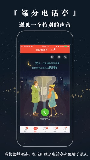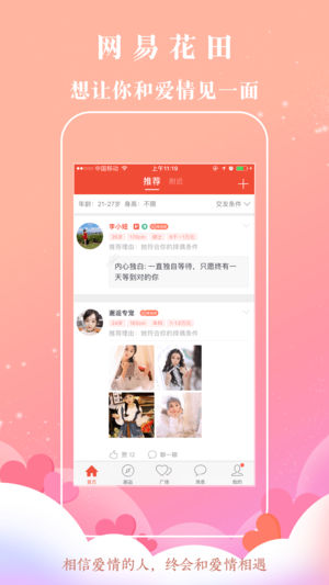 网易花田,超3000万优质真实用户的脱单选择,每8分钟就有一对用户脱单。来花田,遇见对的人! 【优质】名企白领,高收入,优质单身用户的高品质恋爱社区 【真实】真人头像,身份证认证,学历、职业、房产、车辆多重资料认证 【安全】高信用会员保护机制,屏蔽骚扰,放心交友 【懂你】网易大数据智能匹配,比你更懂你的交友需求 上网易花田App,谈一场不将就的恋爱 特色功能 【遇见】左划右滑,遇见心仪的人 【缘分电话亭】和陌生人打一通缘分电话,谈一场声音的恋爱 【趣味问答】契合度趣味问答,一分钟了解彼此,快速匹配 【桃花信】寄出匿名小笺,接收浪漫桃花,缘分早已注定 联系我们 新浪微博:网易花田 微信公众号…