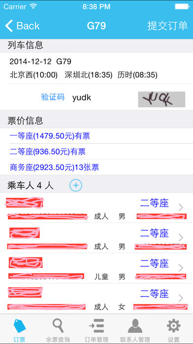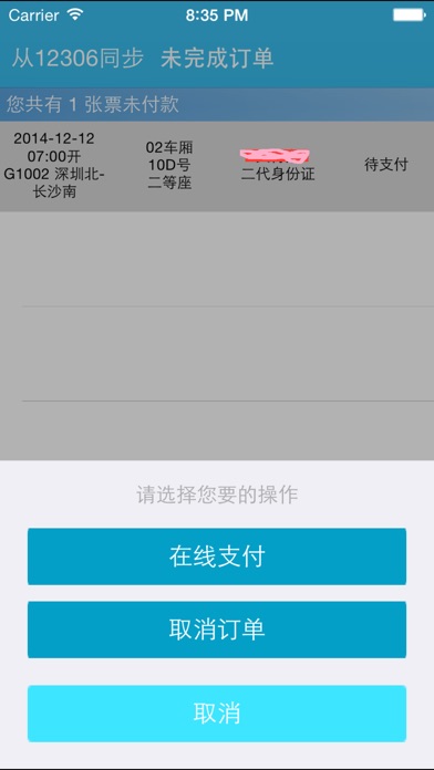 支持 支付宝 付款,支持60天(含当日)内的购票,无任何手续费。 简约而不简单,专为火车票官方网站(www.12306.cn)定制移动客户端。 不排队,不早起,5 步轻松搞定火车票。 登录-搜索车票-添加乘车人-提交订单-付款,买票也就仅此而已,您还可以方便快捷的改签和退票。 主要功能: 1、登录/注销,成功登录后,我们将保留登录状态,只要不超时(20-30分钟内),下次不用登录,您便可继续使用。 2、用户注册、登录、修改密码、找回密码 简单方便。 3、预订、支付、改签、退票 方便快捷,一气呵成。 4、订单管理:订单查询,取消订单,订单改签,退票。 5、联系人管理:新增联系人,修改联系人,删除联系人。 6、余票查询:列车票价,短信或邮件发送接车信息。 7、密码管理:密码修改,密码找回。 8、增加网上支付(招商银行和建行完美支持)。 支持支付的银行:支付宝、招商银行、 建设银行、交通银行、浦发银行、光大银行、平安银行、兴业银行、北京银行、民生银行、华夏银行。 不支持支付的银行:工商银行 、农业银行、中国银行、中心银行、广发银行、上海银行、上海农业银行、中国银行。 技术/使用支持 Email:1651886871@qq.com QQ:1651886871