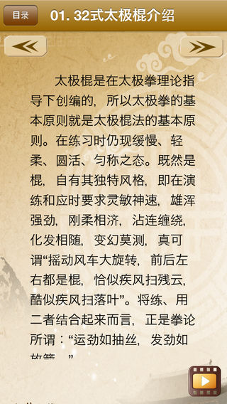太极棍是在太极拳理论指导下创编的,在练习时仍现缓慢、轻柔、圆活、匀称之态。在演练和应时要求灵敏神速,雄浑强劲,刚柔相济,沾连缠绕,化发相随,变幻莫测,真可谓“摇动风车大旋转,前后左右都是棍,恰似疾风扫残云,酷似疾风扫落叶”。 青年人练此棍术,可以刚为主,刚柔相济,提高速度,增强体力;老年人练此棍术,则可以柔为主,练意练神,陶冶性情,祛病延年。 产品示范视频部分提供了32式太极棍介绍、太极棍单人整套演练和集体整套演练。同时配有32式太极棍的相关基础知识简介。 开发者信息 上海华烽电子商务有限公司是一家专注于移动应用开发的现代化高科技企业。旗下纳达书院(www.ndapk.com),面向智能手机用户和平板电脑用户,开发了音乐、诗词文、外语、早幼教、中小学、百科知识等系列移动应用。