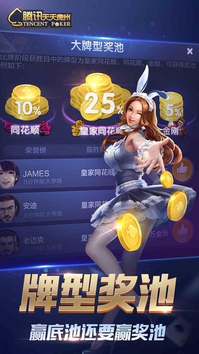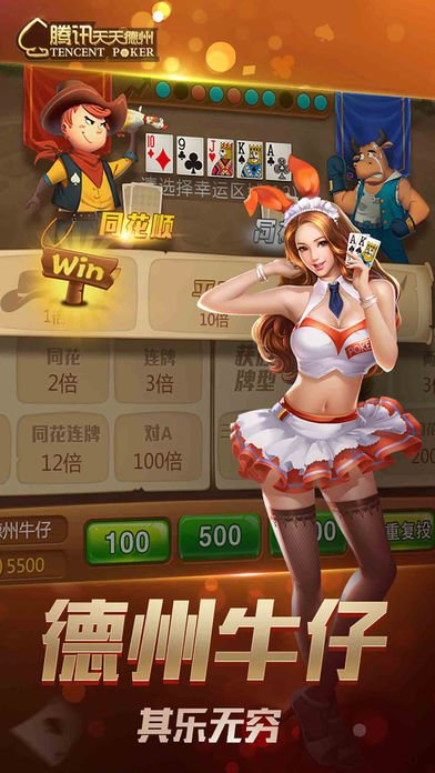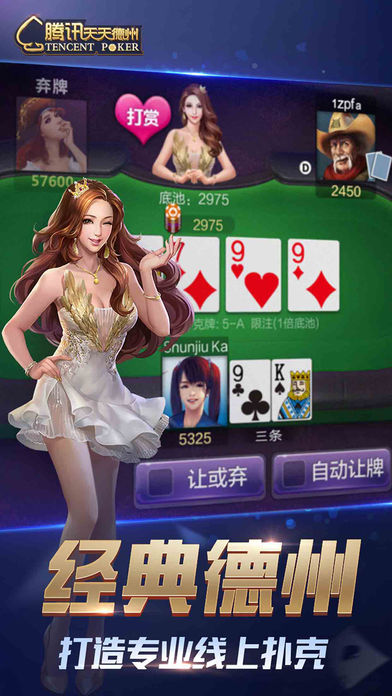 《天天德州》是腾讯游戏精心打造的一款精品扑克游戏,玩法来源于风靡全球的德州扑克,在沿袭经典玩法的基础上融入了中国元素,并提供奥马哈、大菠萝等多种玩法,为玩家带来刺激又丰富的扑克竞技体验。随时随地与微信、手Q好友一起玩,排行榜争夺战、互赠礼物,秀牌技、秀排名,2016年的潮流就是和好友一起玩天天德州。来吧,加入天天德州,亮出你的底牌!