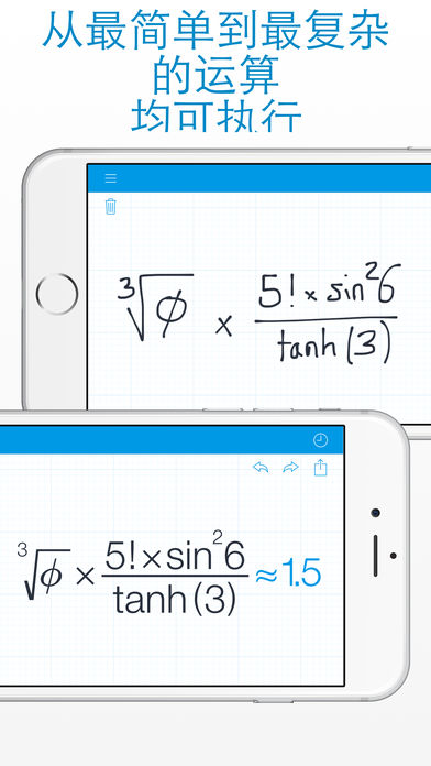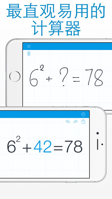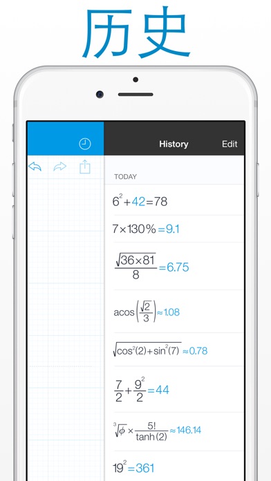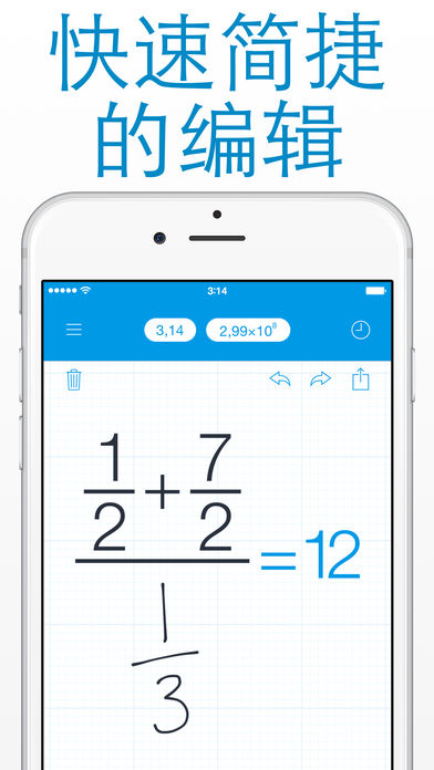 ** Apple 将其分类为“精华”级应用程序 ** ** CES 2013 – 移动应用程序对决优胜者 ** MyScript© 计算器能进行手写数学操作,书写自然。 **您 iPhone 或 iPad 的免费手写计算器** 方便、简单并且直观,只需要在屏幕上写下数学表达式,MyScript 技术便能将符号和数字神奇地转化成数字文本并实时给出结果。 获得与纸上书写相同的体验,并拥有数字设备的优势(勾除、实时给出结果等)。 手动求解数学方程,无需实际自行运算数字。 优点与功能 - 无需键盘,运用直观、自然的方式,输入并计算数学表达式 - 运用勾除笔势轻松删除符号和数字 - 撤销/恢复功能 - 将您的结果复制到剪贴板或导出到其他应用程序。 POWERPACK(可在应用内购买) - 立即重用继续进行繁长的运算,或将结果用在新的计算中。 - 内存:将结果保存到内存。在之后随时将其用于计算。 - 历史:检索所有过去进行的计算,可重用和导出。 支持的运算符 • 基本运算: +, -, ×, ÷, / • 乘方、开方、指数:7²、√,、∛、e³ • 其他运算: %, |5|, 3! • 括号: ( ) • 三角函数:cos、sin、tan、cot、cosh、sinh、tanh • 反三角函数:acos、asin、atan • 对数:ln、log • 常量:π、e、phi 重要说明:如果您想要报告在使用 MyScript Calculator 时遇到的问题,或者只是想要问 MyScript 问题,请不要使用应用程序反馈空间,因为我们无法在此回答问题。 请通过以下方式发送您的反馈: https://support.myscript.com/ 请查阅我们的常见问题页面: http://support.myscript.com/faq/calculator/1.3/ios/page-myscript-calculator-ios-faq-cn.php