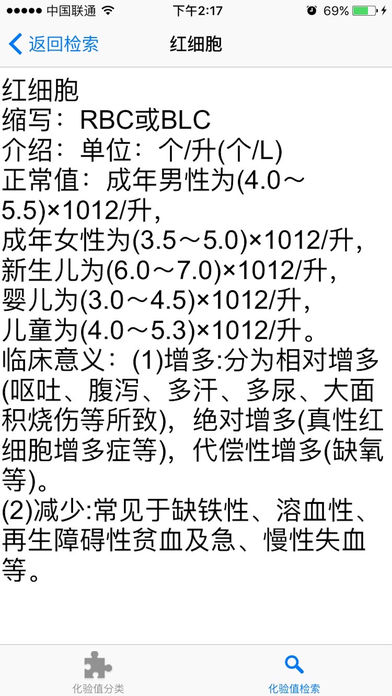 怎样识别化验报告 到医院就诊或体检时,各种化验检查是经常要遇到的。当然,结果需要医生去分析,但您也可通过识别相关符号,对结果有个初步认识。 一般来说,检验结果分为定性检验和定量检验两种。 定性检验检查物质的有和无。 当要表明被检验物质的有或无时,即为定性检验的结果,一般用:“(+)、POSITIVE、POS”等表示“阳性”;用“(±)”表示“弱阳性”;以“(-)、NEGATIVE、NEG”等表示“阴性”;有时也用“NORMAL、NORM”等表示“正常”或“阴性”的含义。 有时,(+)的多少,还能表示某种疾病病情发展程度上的严重性,也就是代表数量上的变化。 例如:得了糖尿病,经常做尿糖试验,(+)、(++)、(+++)的符号,就说明糖尿病的病情有所变化:(+)为病情轻,(-)为病情得到控制,而(++)和(+++)说明病情没有得到控制,在继续恶化和发展; 患有胃、十二指肠溃疡病的人,大便隐血试验(+++)或(++++)则说明患者出血的严重程度。 但“阳性”或“(+)”并不一定代表“检查结果异常”。例如:乙型肝炎“两对半”的检验结果中,乙肝表面抗体(缩写为HBsAb或抗HBs),是一种保护性抗体,可中和乙肝病毒,抵御再次感染。表面抗体“阳性”或“(+)”说明:可能以往有乙肝感染或隐性感染史,目前正处于恢复期;还可能是接种过乙肝疫苗的结果。接种乙肝疫苗的目的,就是希望产生保护性抗体,达到预防乙型肝炎的目的。因此,“阳性”或“(+)”并不一定代表“检查结果异常”。 定量检验检查物质的多与少。 当要表明被检验物质的多少时,即为定量检验的结果,则用“具体数值”的形式报告,并附有结果的正常参考值范围,但不同医院、不同方法检测所使用的正常参考值可能略有差异。一般用:“HIGH、H”等表示“数值高于正常”;以“LOW、L”等表示“数值低于正常”。 在一般情况下,超出了正常参考值范围都可能属于异常。例如:血常规里的白细胞计数(WBC)即为定量检验结果,正常成人参考值范围为“(4~10)×109/L”。白细胞增多常见于严重创伤、感染、出血、中毒、血液疾病等;其减少常见于病毒性感染、严重败血症、药物或放射线损伤以及某些血液病等。 对于异常的检验结果,除了上述的表示方法以外,有些化验报告单上还会用特殊的字体或符号(如“*”)给予着重指出,以提醒医生和患者注意。 因此,当了解了这些常识之后,你就可以对自己的化验结果心中有数,并可以向医生进行重点询问。本软件不但设计有正常数值范围,而且提供了异常的原因,是看懂化验单的小工具。