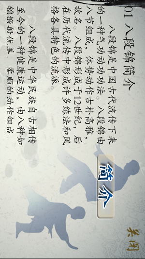 八段锦是一套动作优美、编排精炼、祛病健身效果俱佳的健身气功功法,它由八组如锦缎般优美、柔顺的动作组成,更是国术精华之集锦,对强健体魄、提升工作效率、延缓老化过程甚有帮助,从古至今深受人们的喜爱。 产品示范教学视频介绍了八段锦整套演练、功法内容、功法特点、动作讲解(动作要点、错误与纠正、功法作用)、全套动作示范等,并配有八段锦动作讲解的文字说明,便于理解。 八段锦示范视频具体包含以下内容。 01 整套演练 02 内容简介 03 功法特点 04 预备式 05 第一式 两手托天理三焦…