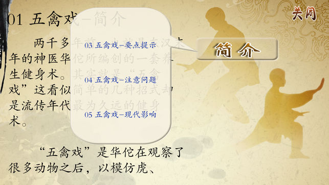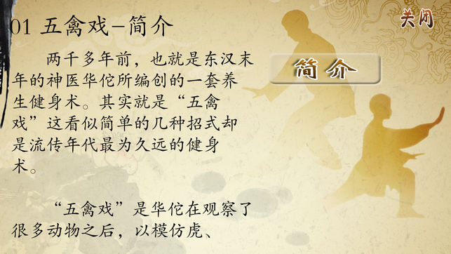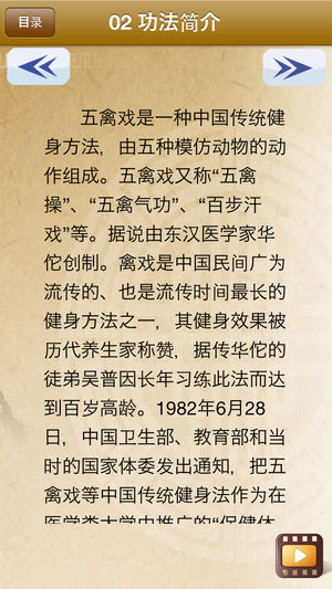 五禽戏是东汉末年的神医华佗所编创的一套舒展筋骨、畅通经脉目的养生健身术。它由5种动作组成,分别是虎戏、鹿戏、熊戏、猿戏和鸟戏,每种动作都是模仿了相应的动物动作。每戏又分两个动作,分别为:虎举、虎扑;鹿抵、鹿奔;熊运、熊晃;猿提、猿摘;鸟伸、鸟飞。每种动作都是左右对称地各做一次,并配合气息调理。 产品示范教学视频介绍了五禽戏的整套示范演练、功法简介、动作讲解(虎戏、鹿戏、熊戏、猿戏和鸟戏)和功法演示等,并配有五禽戏介绍(简介、历史渊源、要点提示、注意问题、现代影响、古谱)及五禽戏动作讲解的文字说明,便于理解。 五禽戏示范视频具体包含以下内容。…