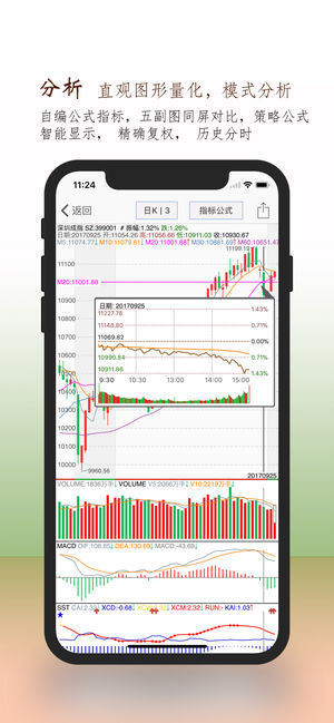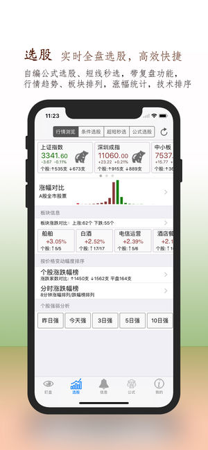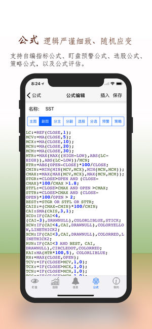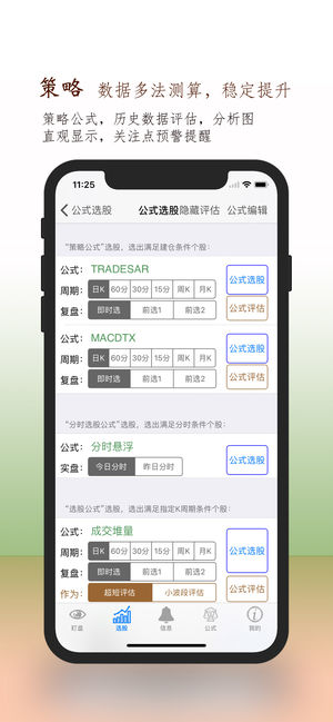 通过行情量化分析、形成交易理念,通过公式化表达,利用历史数据评估;实盘中,全市公式选股,盯盘所有个股,手机App推送信息通知; 支持自编写股票公式炒股软件,策略性交易理念:自编策略评估,策略绑定个股操作,全景行情分析图查看,智能行情分析选股,带趋势指示,全功能盯盘并预警。 特色功能: 【支持自编写股票公式】 支持自编公式,能让自己特独的操作方法直观化,系统化,本软件全面支持多种类型自编写股票公式: 1,公式选股:支持月/周/日/15分/30分/60分周期,以及自编分时公式选股,盘中即时数据选股,支持复盘回溯选股,支持结果按日涨幅排序; 2,指标公式:支持多副图,多周期(5分钟/15分钟/3…