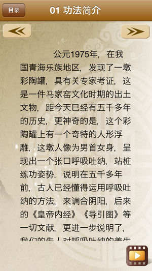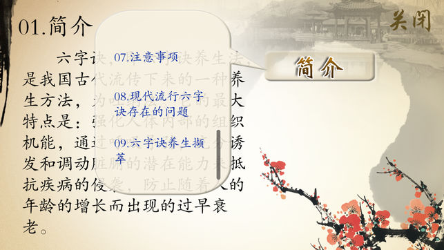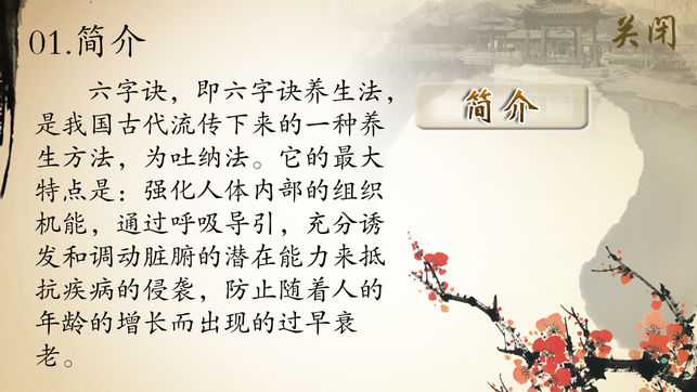 “六字诀”是我国古代流传下来的一种养生方法,为吐纳法。它的最大特点是:强化人体内部的组织机能,通过呼吸导引,充分诱发和调动脏腑的潜在能力来抵抗疾病的侵袭,防止随着人的年龄的增长而出现的过早衰老。 产品示范教学视频简要介绍了“六字诀”的源流、特点和习练要领,对功法的每一个动作都进行了分解说明,并附有动作要点、易犯错误、纠正方法和功理作用,以利于习练者参考对照,不断提高,起到祛病强身、延年益寿的作用。并配有“六字诀”相关介绍(功法介绍、历史沿革、风格特点、锻炼方法等)及功法讲解的文字说明,便于理解。 《六字诀》示范视频具体包含以下内容。…
