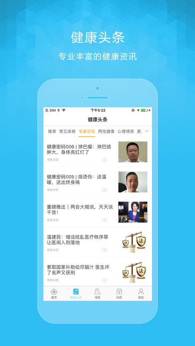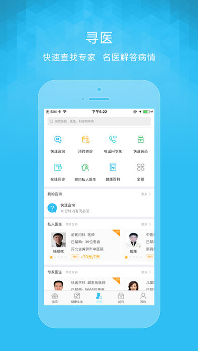 我们的用户可以随时随地使用手机向在线医生发起免费提问,咨询自己、朋友或亲人的健康问题;可以通过电话医生、家庭医生与希望的大夫直接电话沟通;还可以直接找到三甲医院的专家医生,享受预约转诊的服务,告别一号难求,一病难看的问题。 支持Apple【健康】应用,授权后可以检测您的运动数据,更好的了解您的健康情况。 功能一览: [快速提问]无论是头疼脑热,还是疑难杂症,都会有最专业,最贴心的医生十分钟内解答您的问题。 [预约转诊] 帮助您预约三甲医院的医生,免除您就诊烦恼 [电话服务] 家庭医生和电话医生服务,感觉不舒服,可以直接给医生电话咨询 [疾病自查] 身体不舒服的时候,您可以根据症状自查,自己也能给自己治疗 [药品商城] 选药、买药不用走出家门,直接在寻医问药里购买 [寻医页] 可以方便、快捷的直接查找您想找的医生 [健康头条] 全新视角,健康资讯一网打尽。