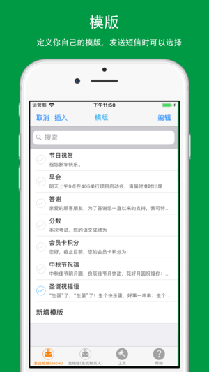 使用该软件,你可以群发类似这样个性化的短信:"{姓名},新年快乐" ,在实际发送时,短信内容就会被替换成"张三,新年快乐",“李四,新年快乐”,“王五,新年快乐“,每个人收到的短信是不一样的哦,当然也可以把”{姓名}“ 去掉,发送完全一样的短信。 完全自定义短信,例如,编辑“尊敬的{姓名}{尊称}, 您的会员卡:{会员号},还有{积分数}积分”,在实际群发短信时,就会变成这样:“尊敬的张三女士,您的会员卡:101,还有10个积分”,“尊敬的李四先生,您的- 会员卡:102,还有20个积分”,“尊敬的王五先生,您的会员卡:103,还有30个积分”。 , 您可以在电脑上创建Excel文…
