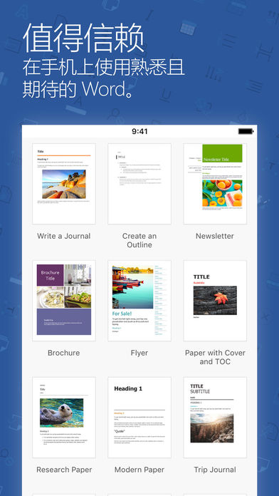 *** Word 已准备好支持 iPad Pro,在 12.9 英寸的屏幕上呈现出精美的外观。在 iPad Pro 上可以免费使用 Word 文档阅读功能。若要创建和编辑文档,你需要具备合格的 Office 365 订阅。提供 30 天免费试用。*** 专为 iPad、iPhone 和 iPod touch 设计的 Microsoft Word 应用。 现在,Word 文档在平板电脑和手机上看起来比以往更美观。所创建或编辑的文档在电脑、Mac、平板电脑和手机上都能如你所想精美呈现,可放心使用。Word 拥有熟悉的 Office 外观与直观的触控体验,能立刻轻松上手。 在 iPhone、iPad Air 和 iPad mini 上,Word 核心功能均免费提供,包括查看、创建和编辑文档。也可以通过合格的 Office 365 订阅享受完整的 Word 功能。在 iPad Pro 上,你需要 Office 365 才能创建和编辑文档。 精美 Word 文档 •图像、表格、图表、SmartArt、脚注、公式等内容皆能完美呈现。 •在手机上选择真实的文档布局或易于阅读的布局。 •可以从 OneDrive、Dropbox、OneDrive for Business 或 SharePoint 查看电子邮件附件并访问 Word 文档。 •可以从 AirPrint 打印机打印带或不带标记的 Word 文档。 充满信心地创建和编辑 •编辑文档时,在你的电脑、Mac、平板电脑和手机等所有设备上的内容和格式都能保持一致。 •通过字体、图片、表格、图表、文本框、形状、脚注、页面布局等丰富格式,随心所欲表达你的想法。 •跟踪修订、添加批注,并支持与其他人同时处理同一文档。 •多任务处理帮你更迅速地完成任务。将 Word for iPad 与其他与应用程序并排运行(需要 iOS 9)。 要求 iPad Pro:若要创建或编辑文档,你需要符合条件的 Office 365 订阅*,它还可让你获得完整的 Office 体验。 iPad、iPhone、iPod Touch:若要创建或编辑文档,请使用免费的 Microsoft 帐户登录。要解锁完整的 Office 体验,并在 OneDrive for Business 中或 SharePoint 上访问和保存文档,你需要符合条件的 Office 365 订阅*。 *若要在应用内购买 Office 365 家庭版或个人版的订阅,请打开应用。在文档选取器屏幕上,点击“升级”。使用 Office 365 订阅,你可以在 iPad、iPhone 和 iPod touch 上使用 Word、Excel 和 PowerPoint 的所有功能,还可以在电脑或 Mac 上安装 Word、Excel、PowerPoint、Outlook 和 OneNote。 对于从应用内购买 Office 365 订阅产生的费用,将向你的 iTunes 帐户收取,并且将在当前订阅期结束前 24 小时内自动续订,除非在此之前禁用了自动续订。若要在购买后管理你的订阅或禁用自动续订,请转到 iTunes 帐户设置。在有效订阅期内,不能取消订阅。