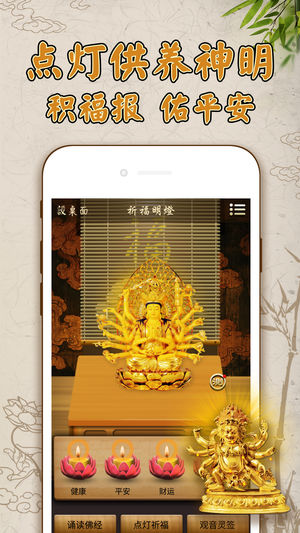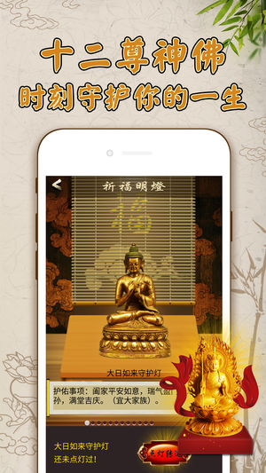 文殊菩萨是主管智慧的菩萨,向她诉说你的愿望,祈求得到好成绩。 为自己为孩子点一盏灯照亮光明前程的灯吧~ 佛灯命火:佛灯之火,永无息灭。佛灯永远照得众生心明眼亮。《祈福明灯》就是一款佛灯祈福并供养佛灯本命佛法相的专业佛教信徒应用。令佛灯在身边长明,无时无刻护佑点灯之人。 佛祖灵签 诚心求签,佛祖会为你指点迷津,针对运势的三衰六旺提供点亮守护佛灯的建议。帮助求签之人达成人生目标並消除障碍。 佛灯本命佛法相 ***大日如来守护灯本命佛法像*** 护佑:阖家平安如意,瑞气盈门,添子添孙,满堂吉庆。 ***财神灯本命佛法像*** 护佑:投资顺利、事业兴隆等一切财富增益事宜(不含赌博等投机事业) *…