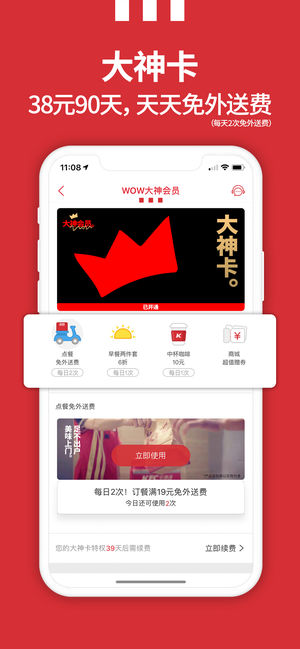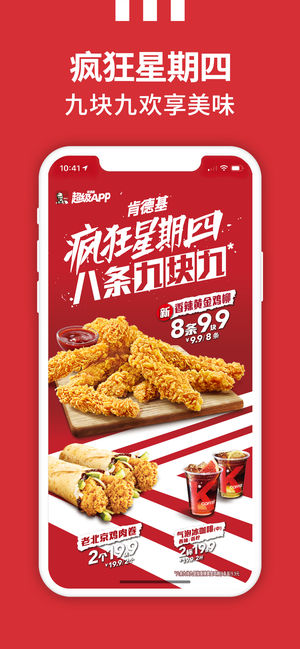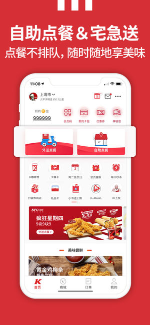 立即登录【肯德基超级APP】 享更多WOW会员优惠! 积V金兑好礼,乐趣享不停! 【玩转最新活动】 - WOW会员大神卡:38元90天,可享:每日2次免外送费、每日1餐早餐两件套6折、每日1杯中杯咖啡10元! - 疯狂星期四:优惠享不停,周周有惊喜!八月起,每周四九块九欢享美味,会员更可凭券提前享! - 超级新人礼:首次下载肯德基超级APP,注册或登录WOW会员可得价值88元超级新人礼! 【欣享贴心服务】 - 手机自助点餐:随时随地,点餐不排队,专用通道快速取餐,助您快人一步! - 宅急送外卖订餐:早餐、午餐、晚餐、下午茶、夜宵、咖啡…… 应有…