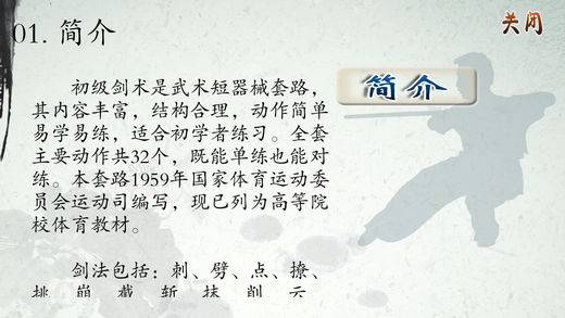 为感谢广大教师、学生、家长、社会各界长期以来对纳达书院的关心和厚爱,本产品限免至月底结束。谢谢! 初级剑术是武术短器械套路,其内容丰富,结构合理,动作简单易学易练,适合初学者练习。全套主要动作共32个,既能单练也能对练。本套路是1959年国家体育运动委员会运动司编写,现已列为高等院校体育教材。 产品示范教学视频简要介绍了武术基本剑法及初级剑讲解教学(内容介绍及剑法、全套正面演练、四段动作分解教学、全套背向演练)。并配有“初级剑”相关介绍(简介、动作名称、剑术基础剑法、剑术基础组合、剑法难点、练习难点)及功法讲解的文字说明,便于理解。 技术支持: 如在使用中有任何问题和建议可联系我们: 纳达书院QQ: QQ1:568791426 QQ2:2475369261 纳达书院微博: http://weibo.com/ndapk 《初级剑》示范视频具体包含以下内容。 01 初级剑内容介绍及剑法 02 初级剑全套正面演练 03 初级剑第一段教学 04 初级剑第二段教学 05 初级剑第三段教学 06 初级剑第四段教学 07 初级剑全套背向演练 开发者信息 上海华烽电子商务有限公司是一家专注于移动应用开发的现代化高科技企业。旗下纳达书院(www.ndapk.com),面向智能手机用户和平板电脑用户,开发了音乐、诗词文、外语、早幼教、中小学、百科知识等系列移动应用。