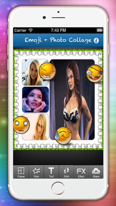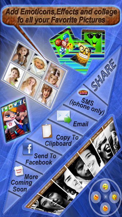 Emoji Collage helps you quickly combine multiple sized photos into one beautifully framed picture & unique collage with caption in seconds. --> COMBINE YOUR PHOTOS TO UNIQUE COLLAGE - 17 amazing irregular layouts. Unique! - 46 adjustable regular layouts - 10 amazing photo effects to apply individual photo - Adjust border's color --> CAPTION & STYLE YOUR PIC & COLLAGE - Add texts, stickers very easily and quickly - 40 creative fonts - 50 amazing stickers(Emotion,Love,Text,Holiday,etc) - Easy to change text color, size, font,background - Easy to Move,resize and rotate the text - Shadow text --> EDIT PIC & COLLAGE WITH PRO PHOTO EDITOR - Edit photo via a built-in PRO photo editor - Zoom in grid to pan,pinch,rotate photo - Pan, rotate or mirror each photo - Rounded corners on photos - Double tap picture to show photo edit menu - Shadow each photo - Shake to clear all photos,stickers,texts --> SHARE ON SOCAIL NETWORKS - Instagram - Facebook, Twitter, Email - Save to Camera Roll album