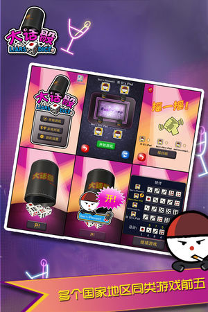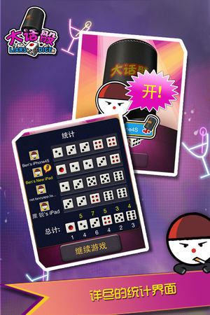 ###大陆,台湾,香港,澳门等多地骰子类游戏排名前列### 大话骰(“大话”是粤语中的“谎话”),又称“步步高升”,在台湾叫“吹牛”,是一种骰子游戏。“大话骰”游戏是酒吧内非常流行的游戏,顾客喜欢在酒吧内游玩这游戏,因为输了的参加者要喝酒。另外,大话骰在台湾也因为综艺节目“小气大财神”而非常流行。 我们把这热门游戏移植到iPhone上,方便大家随时随地进行游戏,无需骰盅,不受限制,拿出iPhone就能游戏. 我们更加入了本地多人对战,支持WIFI和蓝牙连接,让大家在嘈杂的环境下也能得心应手的和朋友进行游戏.赶紧叫上亲朋好友下载这款应用,开始摇骰盅吧!