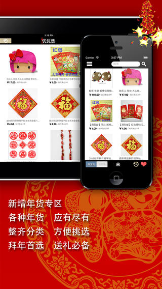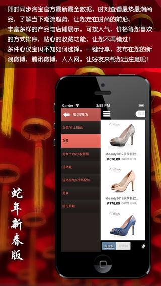 又到一年春节时,马上就要见到许久未见的亲爹亲娘岳父丈母娘了,带些什么最实惠又得到爸妈的喜欢与赞许呢?从【淘宝】春节年货特别版您能快速找到答案㊙!今年物价涨得这么厉害,即使是同样一件宝贝,通过本应用购买还能获得额外优惠,确保您不会过完年生活水平打回解放前! 【淘宝】春节年货特别版 - 是专门为喜爱淘宝网购的亲们定制的一款iOS应用,以界面简约、操作简单、功能贴心为理念,为亲们提供最优质的商品、最舒适的网购环境。 假若给你五小时,可以和情人逛街购物,假若给你五十分钟,可以和朋友浏览购物网站,可是如果你只有五分钟?十五分钟?可以梦想成真吗,【淘宝】春节年货特别版告诉你在拥挤的地铁、在慵懒的床上、在偷闲的办公室、无聊出差途中,都可以快速、便捷、为你量身打造购物清单。价低、质高,帮你品味流行前线。分类详尽、定位清晰、安全可靠,是你约会出游、庆生送礼、居家育子的首选应用。 最权威的淘宝购物软件,女生变美、男生变帅、吃货的天堂、生活用品小助手、妈妈好帮手、宠物乐翻天等多种类别的商品集一身的终极购物利器,荣获本年度最佳购物应用称号! 即时同步淘宝官方最新、最全数据,时刻查看最新、最热、最潮流的商品,了解时下流行趋势,以最快的速度,让您走在时尚的最前端! 丰富多样的商品与店铺排序,是按人气?按价格?还是按信誉?只需动动手指,轻轻一点,就能马上看到你想要的结果! 繁杂的种类、多样的商品,记不住名称怎么办?贴心的收藏功能,让你不再错过! 是选这个?还是选那个?到底哪个更好?哪个更适合自己呢?既然自己拿不定主意,为何不分享给好友,让好友帮忙选择呢?一键式分享,让你的好友来帮你出主意吧! 简洁的界面、流畅的操作、贴心的功能,让购物变的如此简单,选择变的不再困难。还等什么?快来加入吧!没错,就是它,您生活购物娱乐的贴身好帮手! 苹果相关内容讨论组,暨本应用支持QQ群:8694947 苹果相关内容微博,暨本应用支持微博:http://weibo.com/idevicehome