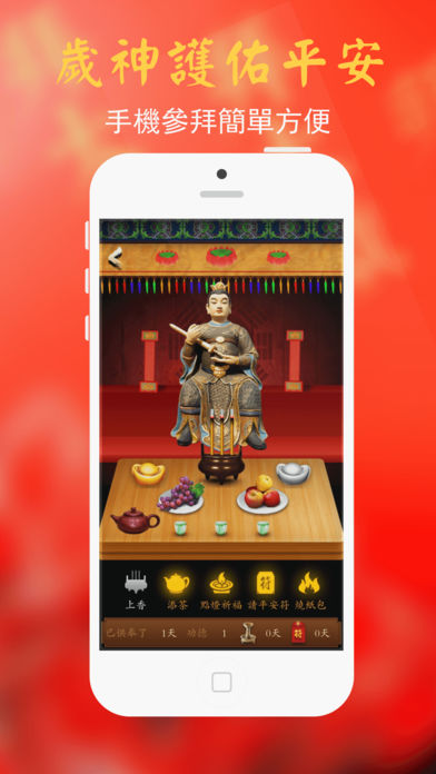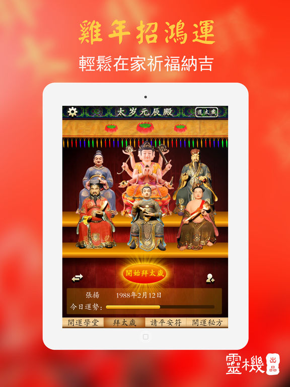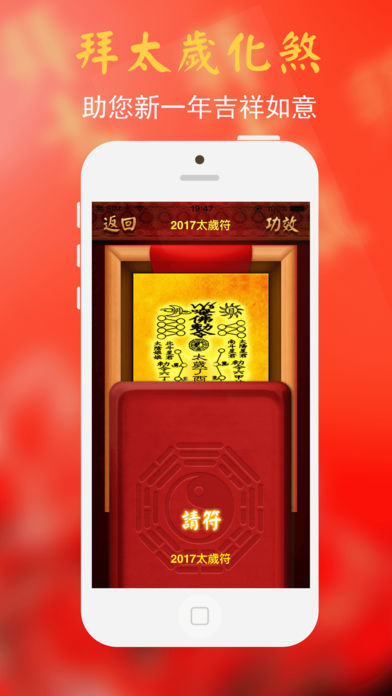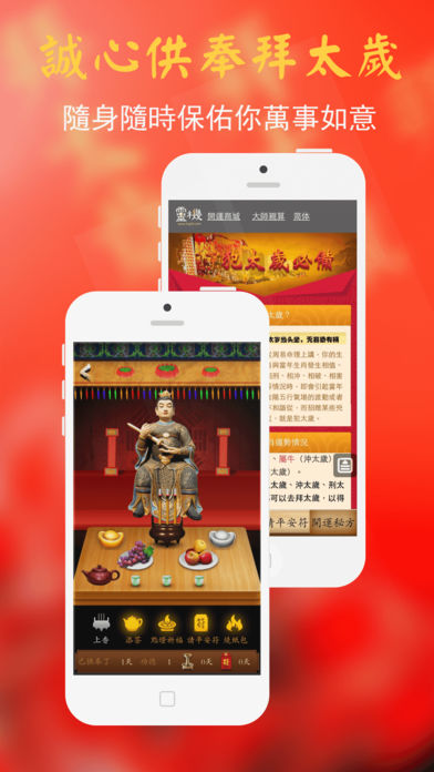 近来你是否心绪不宁、身体有恙?公司内有小人诋毁?夫妻、亲朋感情不佳?下载应用查看自己是否正犯太岁!拜太岁,请符化解,好运自然有! 最受欢迎拜太岁应用。“太岁当头坐,无喜必有祸”。“太岁顺当来,无病恐破财”。 【功能介绍】 1、开运学堂:关于犯太岁等一些民俗只是和开运方法 2、拜太岁:常拜太岁,好运常伴 3、请平安符:天师灵符、护身符时刻护佑您与家人平安 【拜太岁】是专门为2017年犯太岁的人所设计的命理应用,希望犯太岁的朋友可以诚心供奉拜祭,在本命年依然能够万事如意,除了拜祭供奉太岁外,还提供犯太岁最佳化解方式——请太岁符,提供多种灵符,护佑今年犯太岁的朋友。 拜太岁是老百姓传统的民间信仰,就是参拜六十甲子所属的“太岁神”。因为每个人都有一位“太岁星君”主管一生,称为“本命太岁”;而每年又有一位值年太岁(又称流年太岁)主管人们当年的一切(如人们的健康、工作、事业、婚姻等各方面)。拜太岁主要是拜自己的本命太岁和值年太岁。