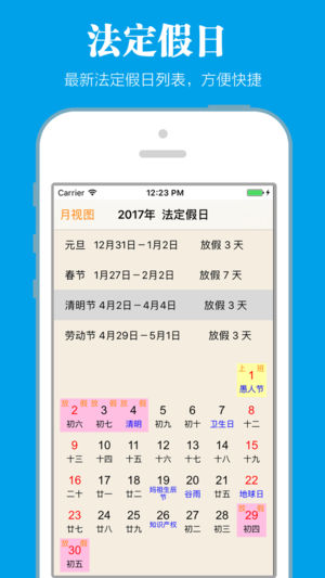 简介: 老黄历, 是一个帮你查询日历的小工具, 比如:阳历,阴历,老黄历,节假日,纪念日, 法定假日倒数... -新增2018年元旦,春节及全年放假和调休,提前安排您的假期。 主要功能: --- 直观的万年历功能 --- - 支持200年超长年份(1900-2100) - 支持直观的阳历,星期 - 实用的本周为一年的第几周 - 支持国际知名的节假日,纪念日 --- 详细的阴历农历功能 --- - 支持详细阴历(农历)以及节假日 - 支持全面的24节气 - 支持数九九功能 - 支持夏三伏功能 --- 实用的老黄历功能 --- - 经典的忌宜提醒 - 详细的天干地支,年,月,日,时辰 -…