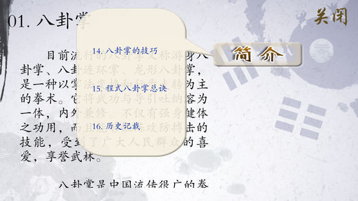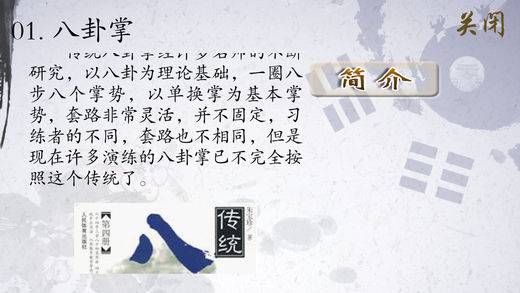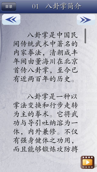 八卦掌是一种以掌法变换和行步走转为主的拳术。清朝咸丰年间由董海川在北京首传八卦掌,至今已有近两百年的历史。它将武功与导引吐纳溶为一体,内外兼修。不仅有强身健体之功用,而且能够锻炼攻防搏击的技能,受到了广大人民群众的喜爱,享誉武林。 产品主要选取了由八卦掌大师刘敬儒先生主讲、示范的优质视频,示范视频包含八卦掌简要介绍、八卦掌趟泥步(直行步、走圈)、基础八掌(猛虎出山、大鹏展翅、狮子张口、白猿献桃、怀中抱月、黑熊探臂、指天插地、青龙探爪)、八大掌(单换掌、双换掌、顺势掌、背身掌、转身掌、磨身掌、翻身掌、回身掌)。并配有八卦掌基础知识相关介绍(简介、基本知识、起源、基本内容、特点、技法要诀、掌法分类、掌法要义、技击原则、武功介绍、八卦掌的技巧、程式八卦掌总诀、历史记载、人物介绍等),便于理解。 《八卦掌》示范视频具体包含以下内容。 01八卦掌简介 02八卦趟泥步之直行步 03八卦趟泥步之走圈 04基础八掌及整体套路 05基础八掌之猛虎出山 06基础八掌之大鹏展翅 07基础八掌之狮子张口 08基础八掌之白猿献桃 09基础八掌之怀中抱月 10基础八掌之黑熊探臂 11基础八掌之指天插地 12基础八掌之青龙探爪 13八大掌及整套套路 14八大掌第一掌单换掌 15八大掌第二掌双换掌 16八大掌第三掌顺势掌 17八大掌第四掌背身掌 18八大掌第五掌转身掌 19八大掌第六掌磨身掌 20八大掌第七掌翻身掌 21八大掌第八掌回身掌 技术支持: 如在使用中有任何问题和建议可联系我们: 纳达书院QQ: QQ1:568791426 QQ2:2475369261 纳达书院微博: http://weibo.com/ndapk 开发者信息 上海华烽电子商务有限公司是一家专注于移动应用开发的现代化高科技企业。旗下纳达书院(www.ndapk.com),面向智能手机用户和平板电脑用户,开发了音乐、诗词文、外语、早幼教、中小学、百科知识等系列移动应用。