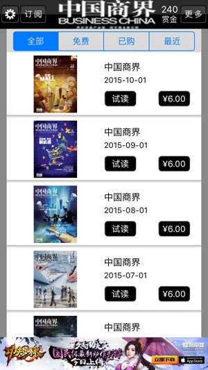 《中国商界》创刊于1995年9月,由中国商业联合会主管,《中国商报》新闻出版总社主办的一本商界精英专属杂志,现为中国商业联合会会刊。《中国商界》位列中国商报新闻出版总社四大杂志之一。对国家的经济有深入的见解及精华的报道,影响力超著。 关于本杂志订阅注意事项: 1、中国商界杂志为月刊,一个月一期 2、订阅杂志,您可以选择 .订阅三个月,价格2.99美元或18元人民币 .订阅六个月,价格5.99美元或40元人民币 .订阅1年, 价格11.99美元或78元人民币 如果订阅成功,订阅起始日期从下个月开始,本月刊物赠送,如果本月刊物还没有发布,该刊物将在发布后自动加入您的书架。 3、过刊价格为0.99…