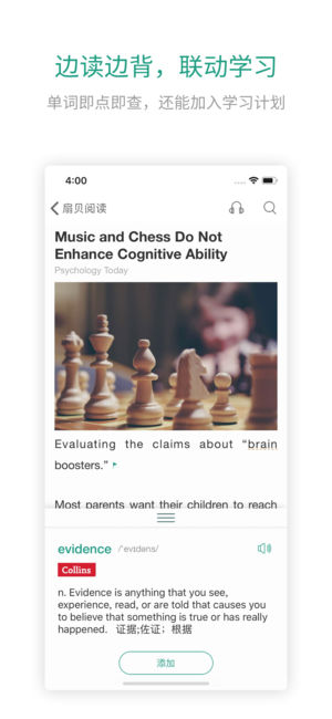 扇贝阅读,为你推送原汁原味的英语短文和原著,它不只是一个“学英语”的APP,更是一个帮你开始“用英语学”的APP。 【英文原著】 经典的英文原著,带你感受原汁原味的阅读体验。 【精选短文】 精心编排的英语短文,让你在轻松的阅读中收获学习和成长。 【学习计划】 阅读中的生词可以即时添加到自己的学习计划中,利用扇贝强大的记忆系统进行学习。 【重难点强化】 文章的重点单词、各类考试(四六级、考研、托福GRE雅思等)的难点单词,都会由系统高亮展示,帮助你查缺补漏。 【图表反馈】 你每天的学习进度,包括完成的文章数、被激活的单词数,都会通过图表生动展示。 【阅读计划】 我们还会协助你制定阅…