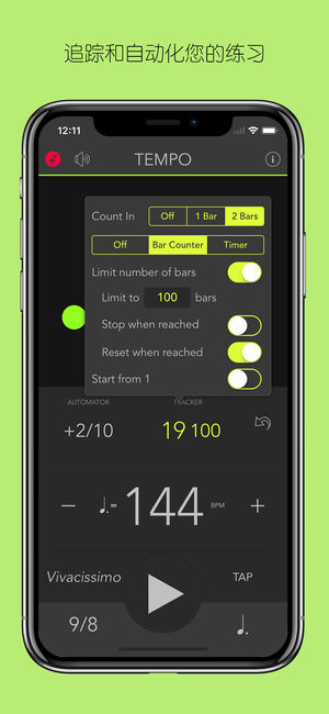 iOS超级节拍器应用程序Tempo现在可用为免费简装版。在iTune登录主页上,Apple将Tempo评为“值得关注新应用”和“最爱应用”。现在你在升级到完整功能包前可享用Tempo的核心功能。 其应用程序的编写都以其功能的高精确度和稳定性做为考量。它也可在仪器处于锁定状态时运作,可成为现场击鼓表演时的一个援助。 特惠包括通过追踪栏数或播放时间助你操作的追踪器模块。 与购买Tempo相对,升级Tempo精简版让你为反面视图获取暗色方案(取代亮色)。 欲观看示范片,可浏览 www.frozenape.com. 功能 组态 • 4种拍号,包括复拍子和复音:1-4/4, 3/8, 6/8…