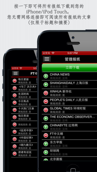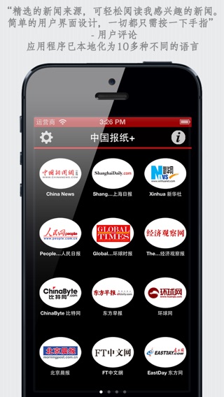 中国报纸+:在英国和德国最畅销的新闻应用程序现登陆中国。 报纸 : China News, ShanghaiDaily 上海日报, Xinhua 新华社, People's Daily 人民日报, Global Times 环球时报, The Economic Observer 经济观察报, ChinaByte 比特网, FT中文網, 东方早报, 环球网, 北京晨报, EastDay 东方网, Yanzhao Metropolis Daily 河北新闻, 21世纪网, People's Daily English, China Business News, CCTV International English, Shanghai Sun, The Economic Observer English, Xinhua English, BeijingToday, Beijing Bulletin, China National News, 大洋网, Peking Press, Guangzhou Daily 广州日报, Xinhua Español, Xinhua Français, People's Daily Français, People's Daily русский, Yun Nan Daily 云南日报网, Beijing Review, CCTV International русский, China Internet Information Center, China Radio International English, China Radio International русский, China Briefing, 体坛网 部分特色: + 在中国发行的多份中文、英文、法文、西班牙文和俄文报纸,一流的用户界面,普遍适用于iPhone/iPad。 + 按版面阅读每份报纸:世界、本地、政治、体育、商业、技术、科学、健康、艺术、旅行等 + 按一下即可将文章分享到Facebook。此外,您可以复制文章,用电子邮件和短信发送文章,也可以在Safari中打开文章。 + 按一下即可将所有报纸下载到您的iPhone/iPod Touch。您无需网络连接即可阅读所有报纸的文章(仅限于标题和摘要) + 根据您的意愿将报纸/版面放置到头版 + 为视觉障碍的用户提供VoiceOver语音支持 + 应用程序已本地化为10多种不同的语言 部分评论: + “精选的新闻来源,可轻松阅读我感兴趣的新闻。简单的用户界面设计,一切都只需按一下手指” - 用户评论 我们希望听到您的意见,欢迎将您的意见发送至:support@sunflowerapps.com,您也可以直接在AppStore上撰写评论。